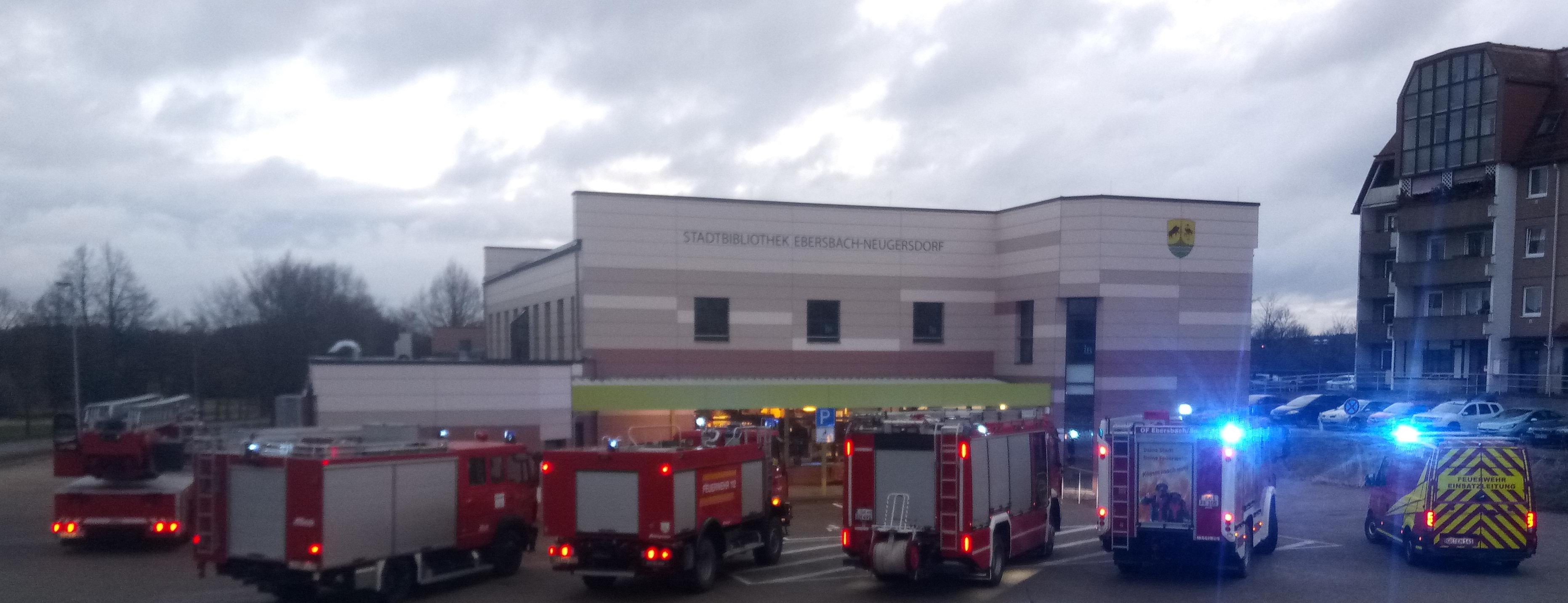 Um 06:22 Uhr alarmierte die IRLS Ostsachsen beide Ortsfeuerwehren. Die Brandmeldeanlage der Bibliothek auf dem Hofeweg hatte die Alarmierung ausgelöst. Wir rückten mit HLF 10, TLF 16/25, DLK 23-12 und TSF-W aus, die OF Neugersdorf kam mit dem HLF 20, LF 10, TLF-W, MZF und GW-N vor Ort.