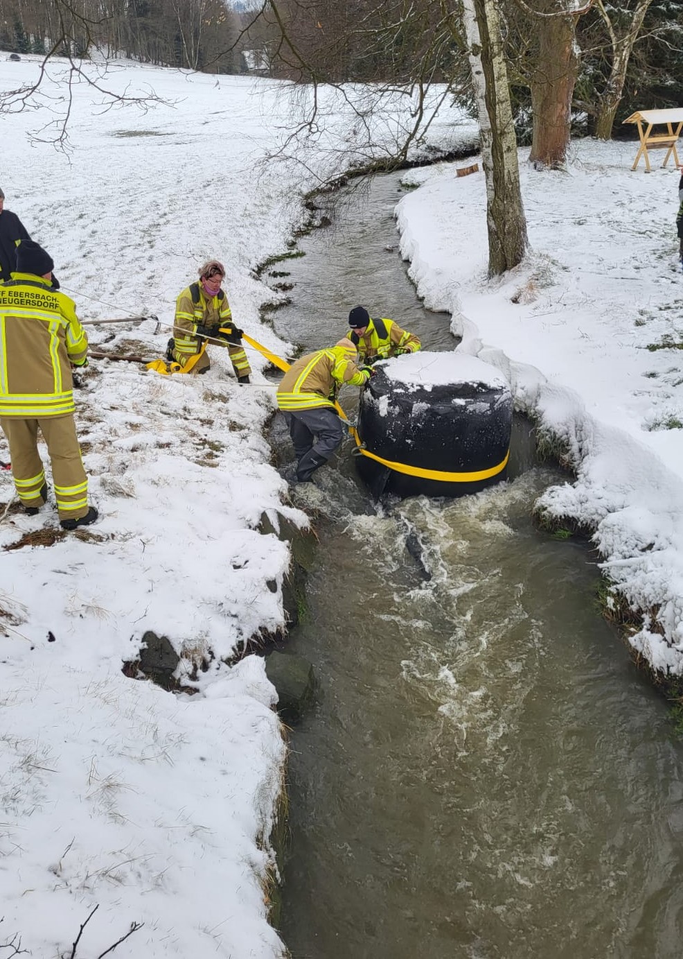Um 09:12 Uhr erhielten wir telefonisch die Information, dass im Bachlauf des Ritterbachs ein Heuballen liegt und droht, unter eine kleinere Brücke gespült zu werden. Dies hätte zum Stau des Wasser und damit zu einer Überflutung im Umfeld geführt. Da einige Einsatzkräfte gerade zum Zwecke eines Ausbildungsdienstes im Gerätehaus waren, rückten das HLF 10 und die DLK umgehend ohne weitere Alarmierung aus. Der Heuballen wurde mittels Spanngurt und Stahlseil gesichert und schließlich aus dem Bachbett gezogen.