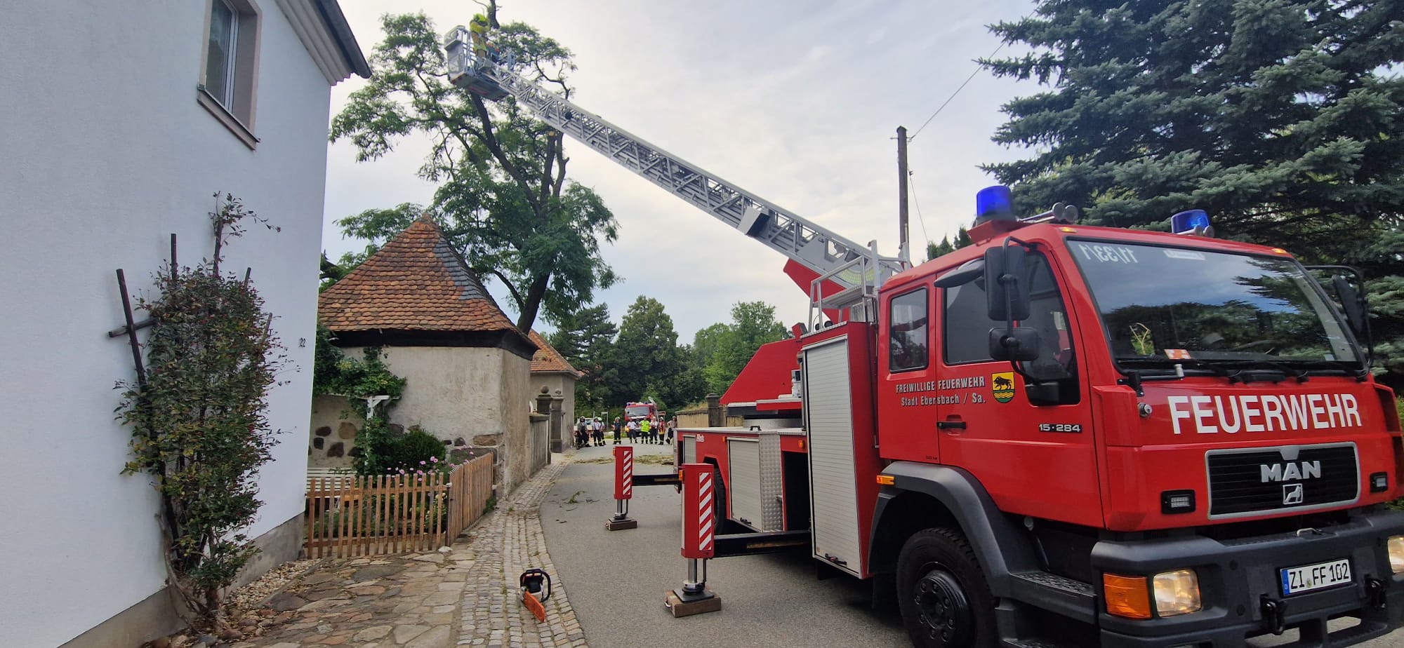 Um 17:20 Uhr wurden wir mit der DLK 23/12 nach Kottmar, OT Obercunnersdorf auf die Hintere Dorfstraße alarmiert. Dort war ein Baum auseinandergebrochen und drohte, auf die Straße zu stürzen. Zur Unterstützung der Kräfte der Gemeinde Kottmar wurde mittels DLK und Motorkettensäge der Baum soweit abgetragen, bis keine Gefahr mehr bestand.