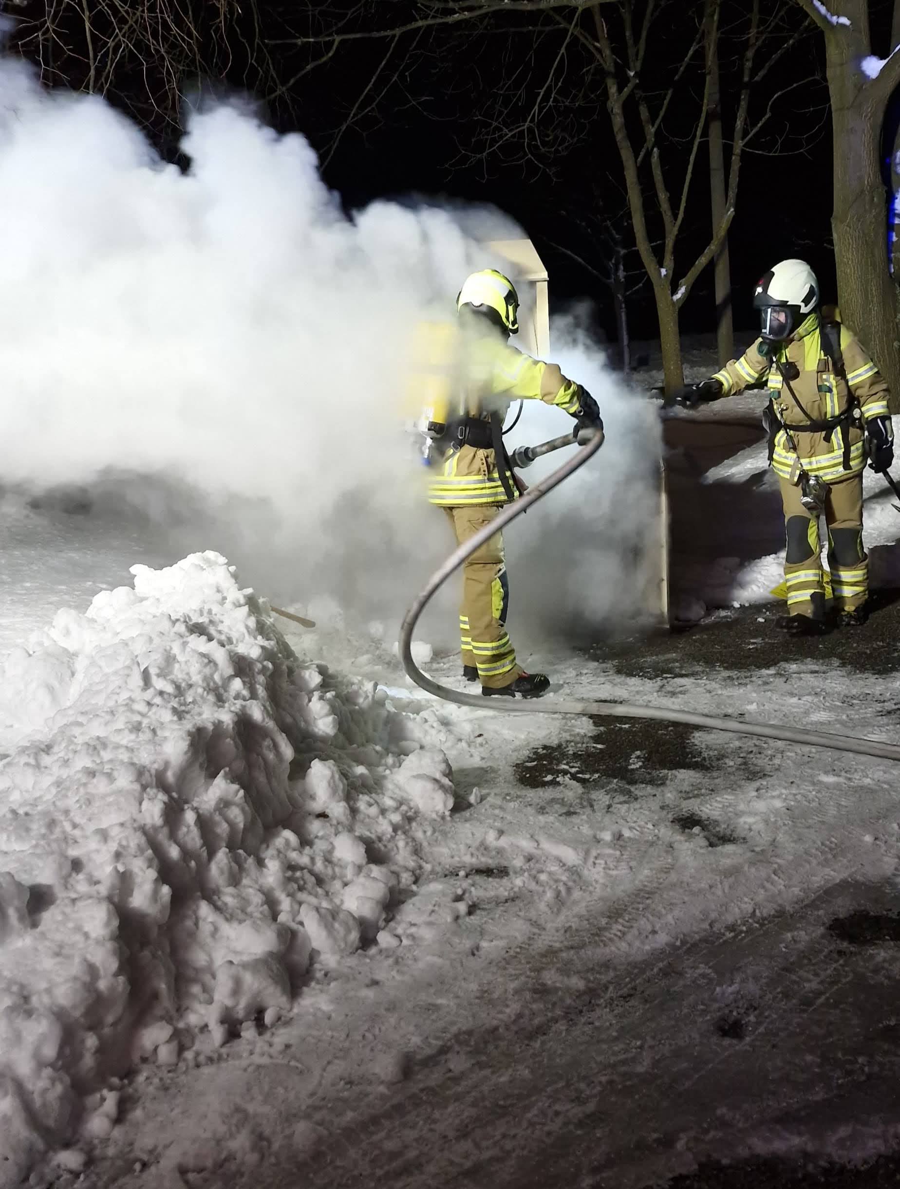Im Bereich Reichsstraße/Lutherstraße brannten die Überreste eines Altkleidercontainers, der ganz offenbar mit illegalen Feuerwerkskörpern gesprengt worden war.