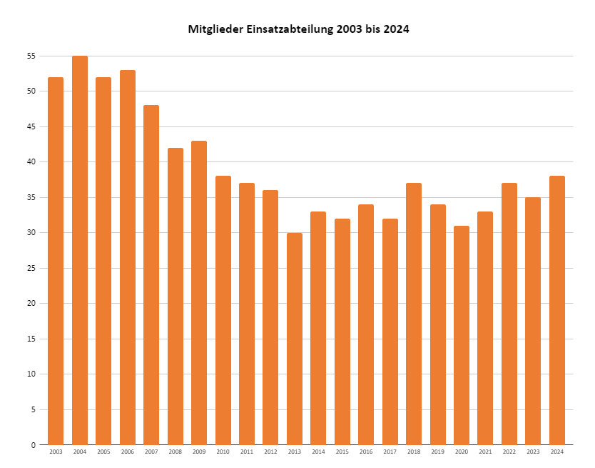 Leider ist die Zahl unserer aktiven Feuerwehrangehörigen seit vielen Jahren tendenziell rückläufig, wenngleich der Abwärtstrend 2013 gestoppt werden konnte und die Mitgliederzahlen seitdem wieder ganz leicht gestiegen sind. Dennoch fehlen uns weiterhin rund 15 Einsatzkräfte, um die nach dem Brandschutzbedarfsplan vorgesehene Mitgliederzahl von 52 Einsatzkräften zu erreichen.