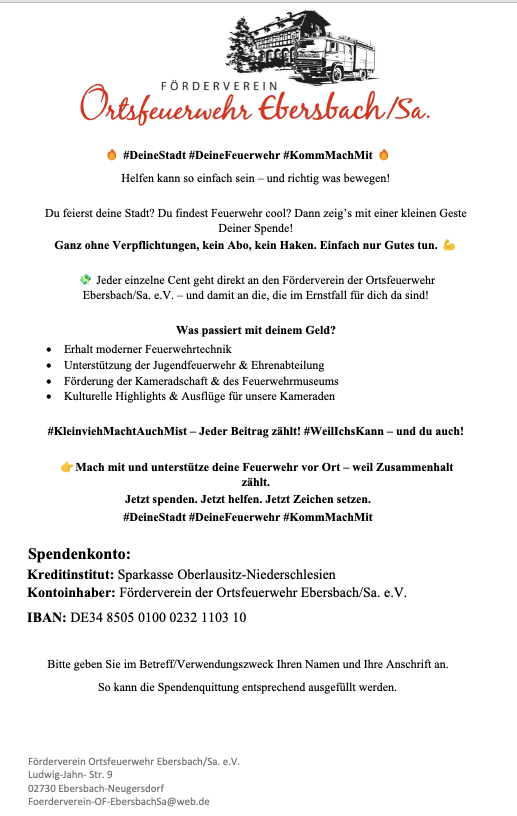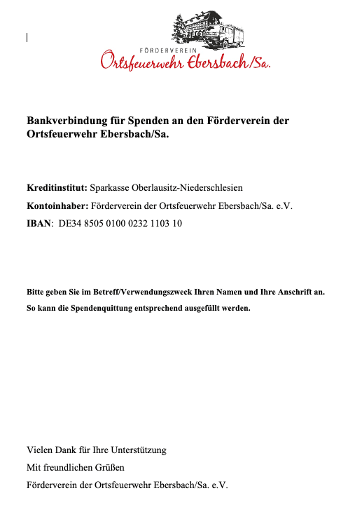 Ein Herzliches und ganz großes Dankeschön gilt allen, die unseren Verein und somit unsere Ortsfeuerwehr bislang durch tatkräftige Hilfe sowie Sach- und Geldspenden unterstützt haben.