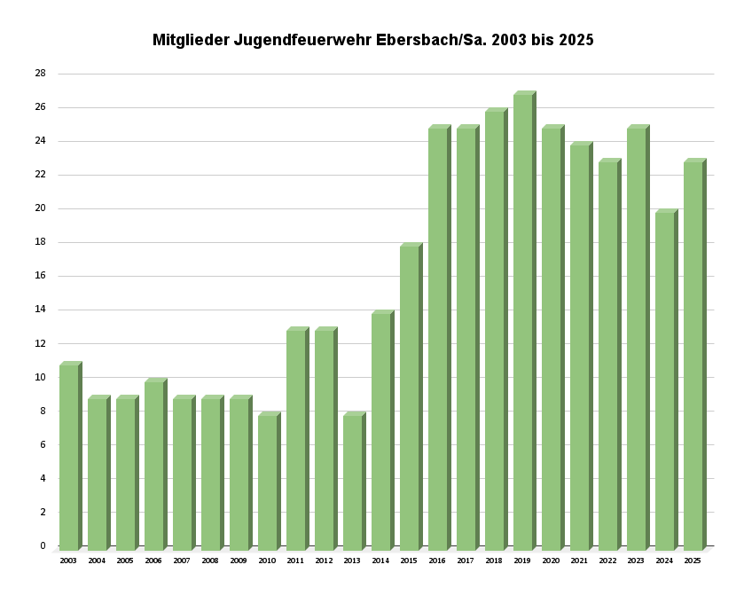 Mit 16 Jahren können die Jugendlichen auf eigenen Wunsch und mit Zustimmung der Eltern in die Einsatzabteilung übernommen werden. Zum Einsatz ausrücken darf aber natürlich erst, wer die Grundausbildung erfolgreich absolviert hat und mindestens 18 Jahre alt ist. Die Jugendfeuerwehr besteht (Stand 31.12.2025) aus 23 Mitgliedern.